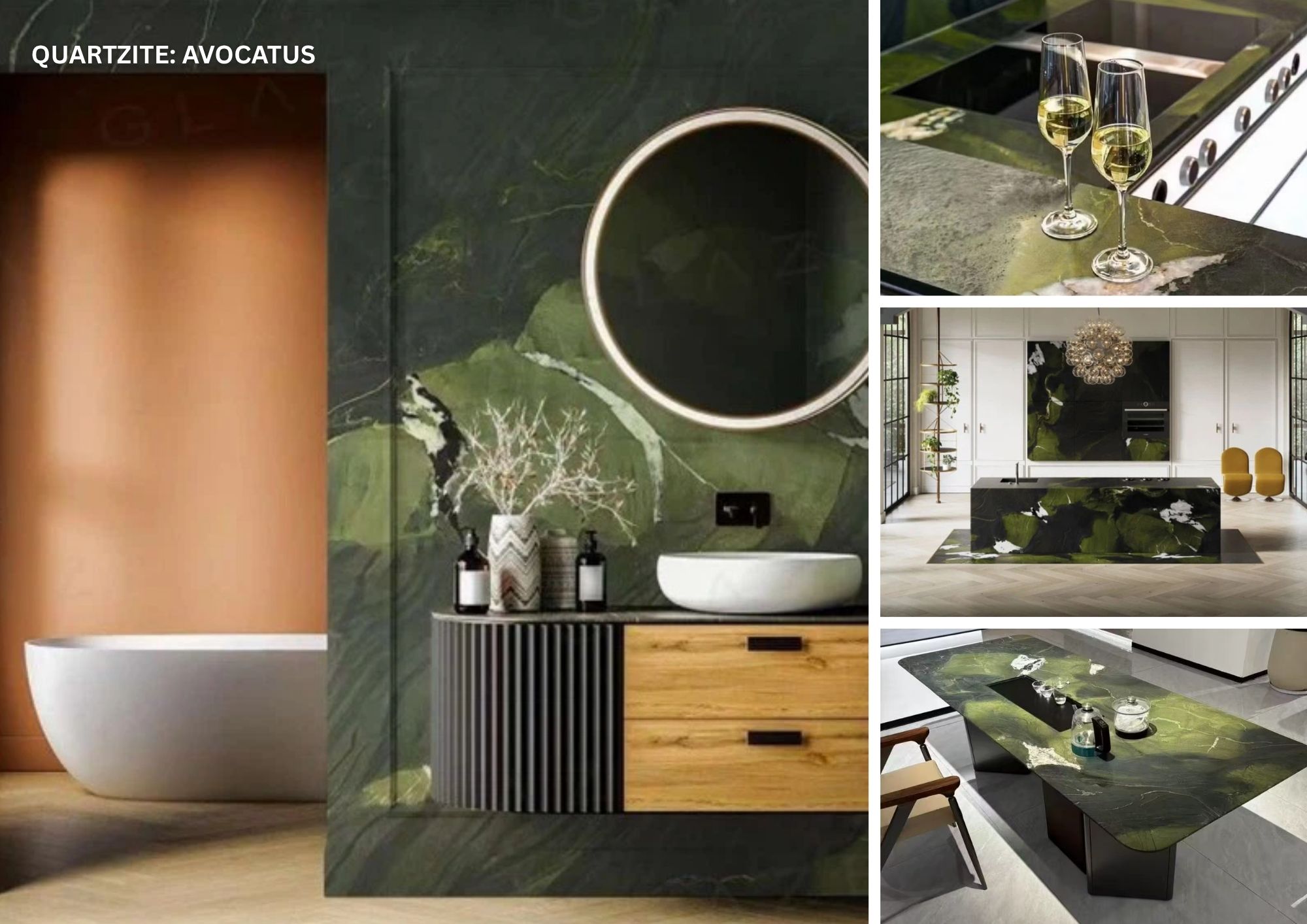 Avocatus quartzite features hues of deep and warm green tones, with white and black accents swirled throughout the slabs. Avocatus is characterized by variations creating a cloudy effect with black and white quartz inserts for a stunning effect on the surface. (BATCH 24590)