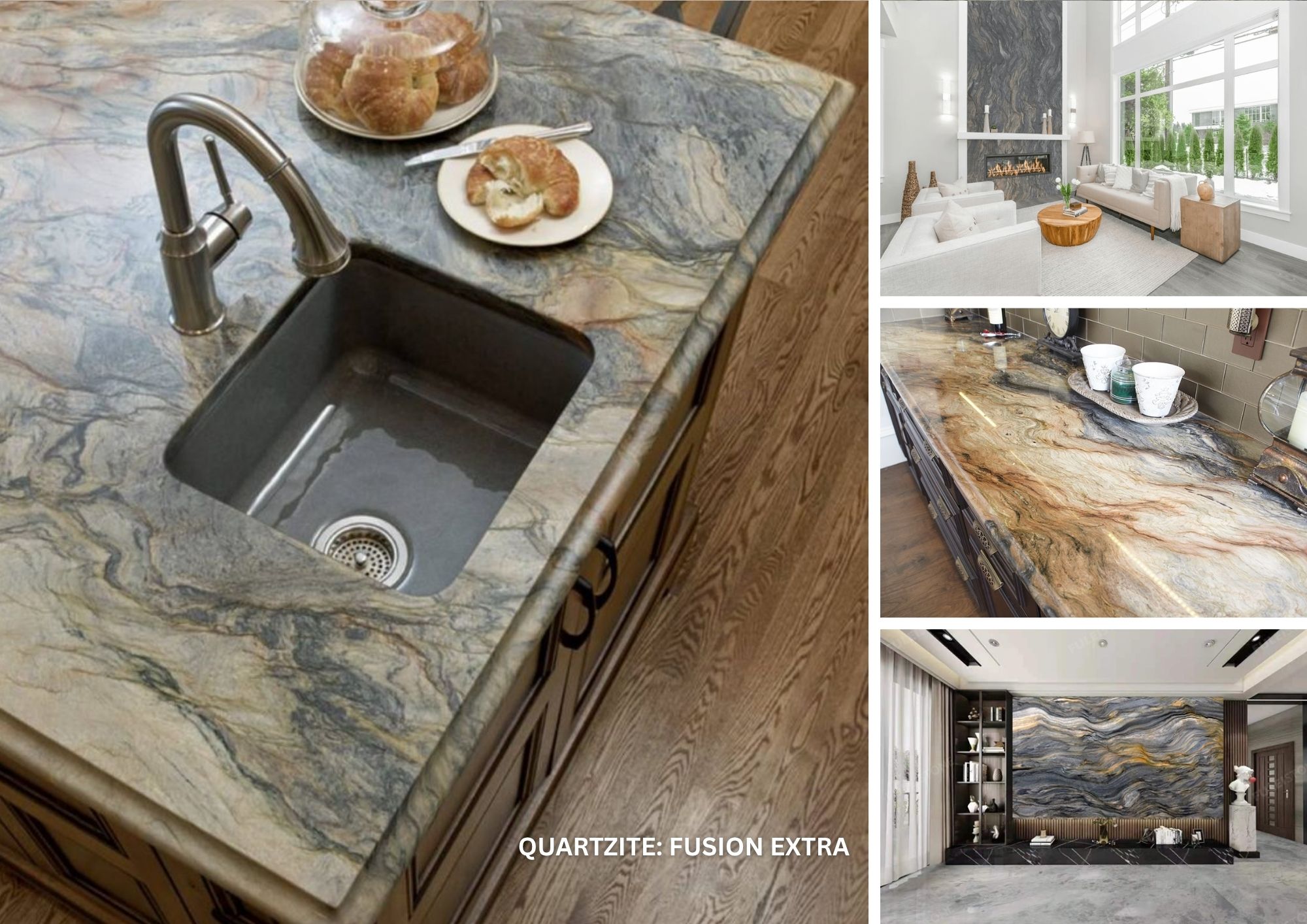 Fusion is a quartzite from Brazil. A unique and colorful quartzite with movement and color in each slab resemble an abstract painting – a piece of art from nature. It is a strong impact material and used for interior designs including floors, counter tops, vanity tops, stairs, columns, sinks & tubs, also can be used in exterior applications. (BATCH 19572)