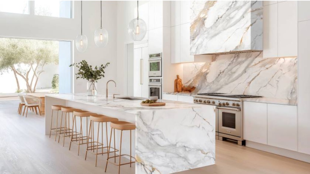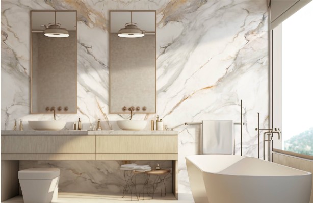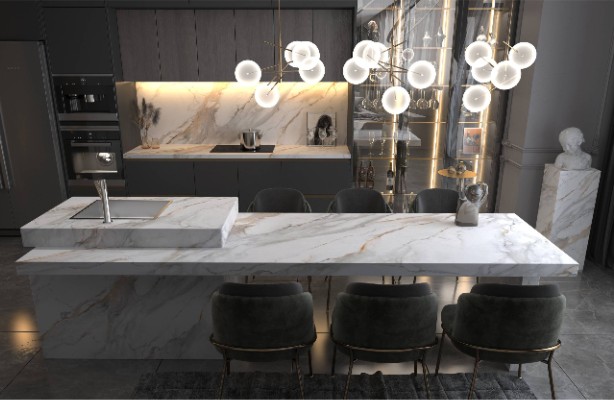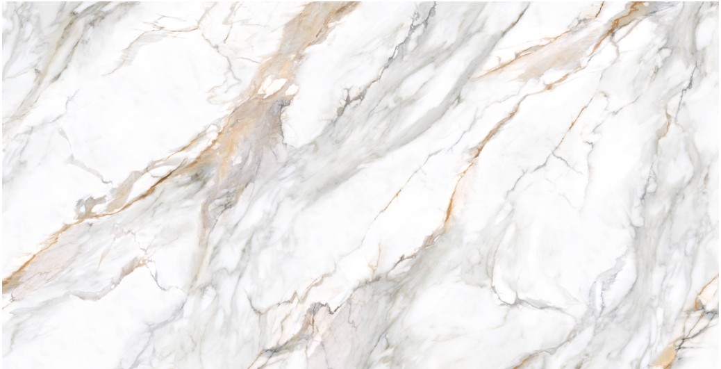 Genesis Calacatta Buckingham features a pristine white background accented by striking gray and golden veining, resulting in an elegant and luxurious aesthetic.