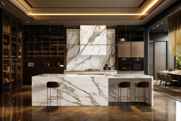 Genesis Macchia Vecchia embodies timeless elegance, offering exceptional versatility and contemporary appeal. Its bold gold and gray veining on a luminous white background exudes sophistication, making it ideal for countertops, backsplashes, and wall cladding.