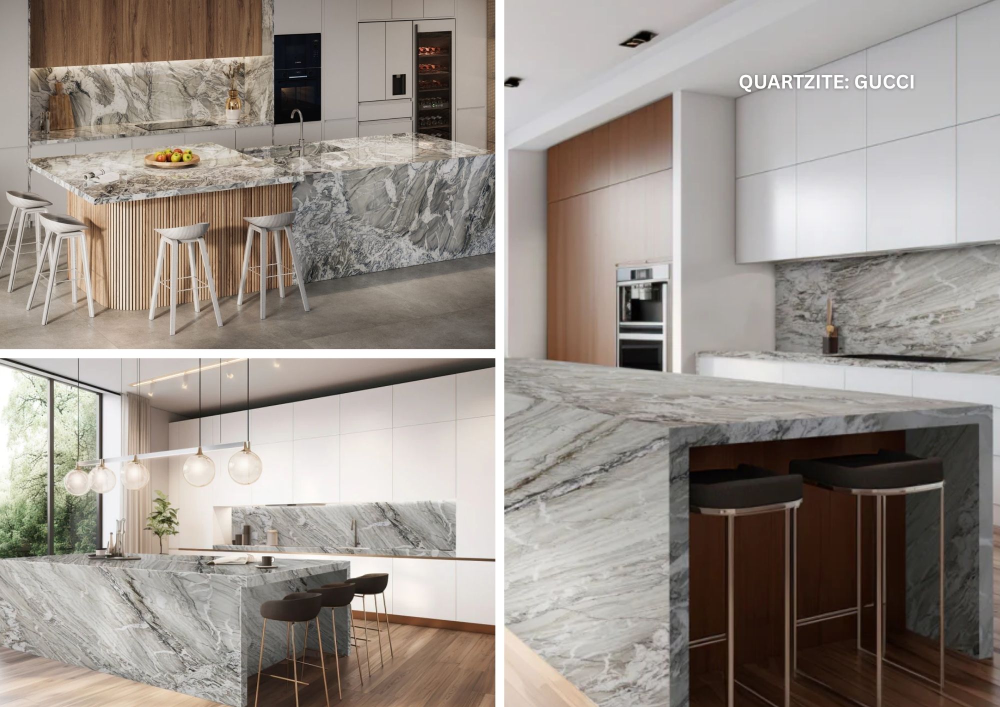 Gucci, quarried in Brazil, is a quartzite with a unique movement with crystal quartz veining throughout. Bold and beautiful with exotic colouring of greens, grey and black.