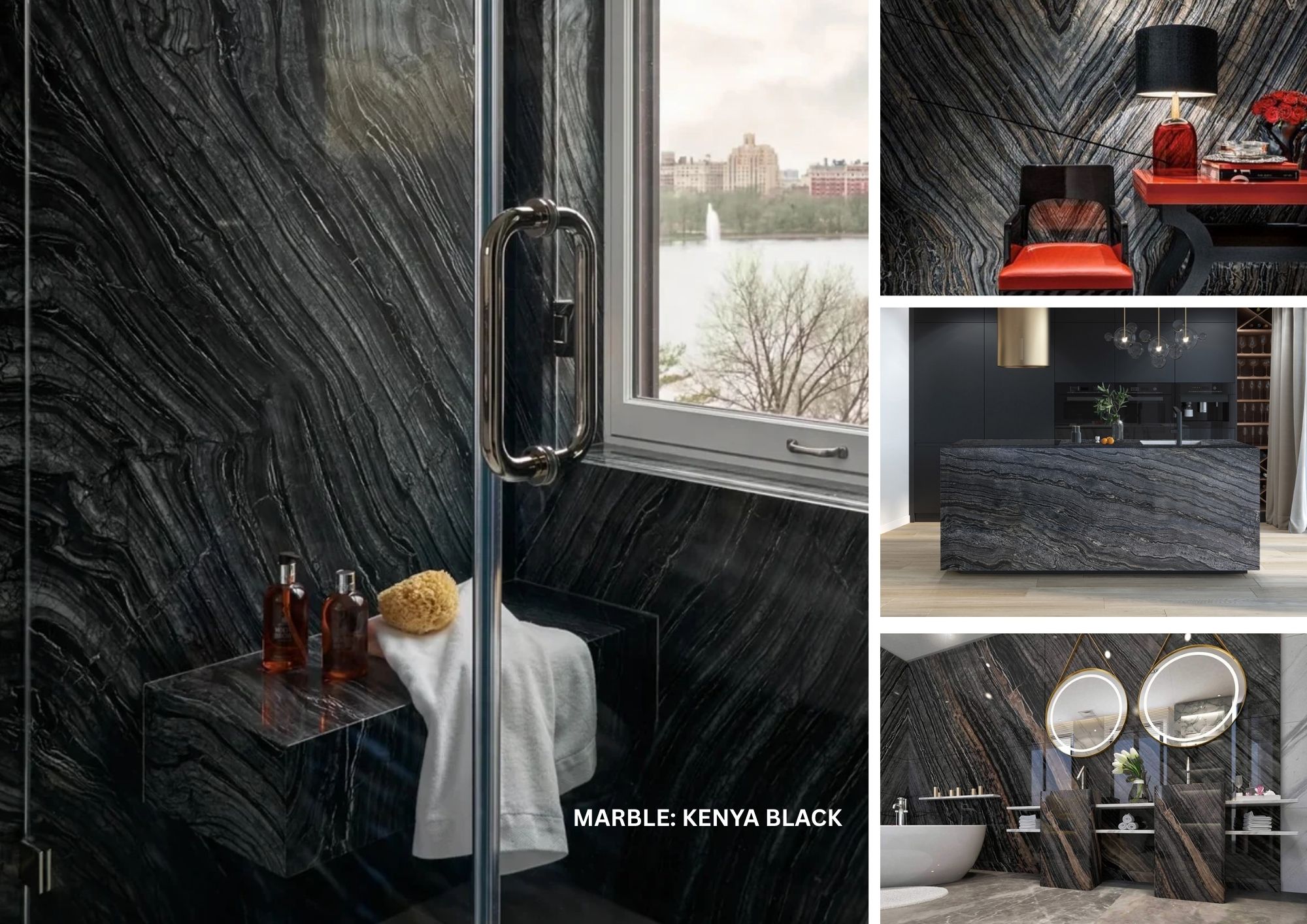 Kenya Black is a boldly dramatic marble with striking veining.
