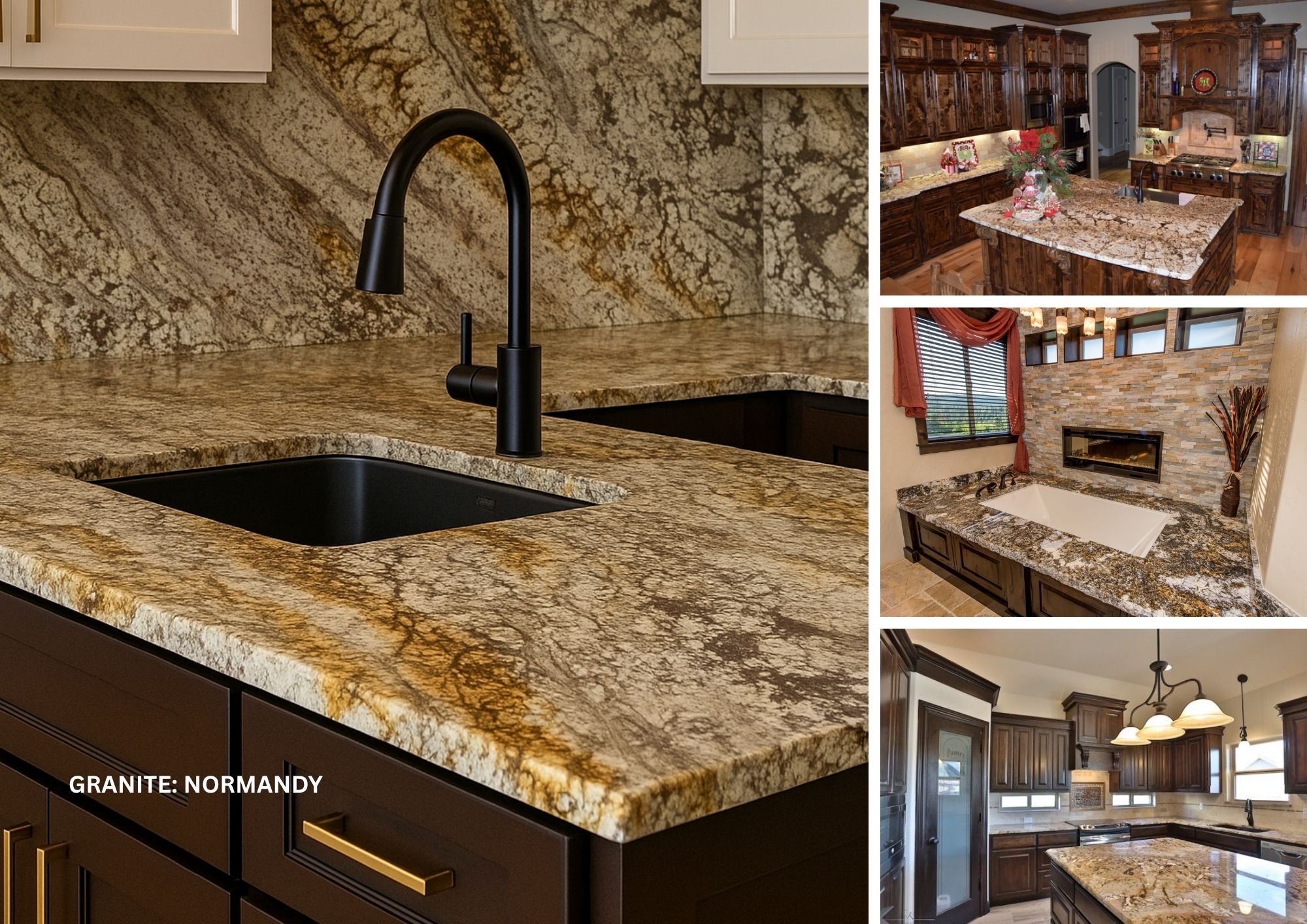 Normandy granite quarried in Brazil is a gold colored slab with an exquisite balance of browns and whites. Together these colors form a beautiful combination of earthy and rustic tones atop a white base. (BATCH 4434)