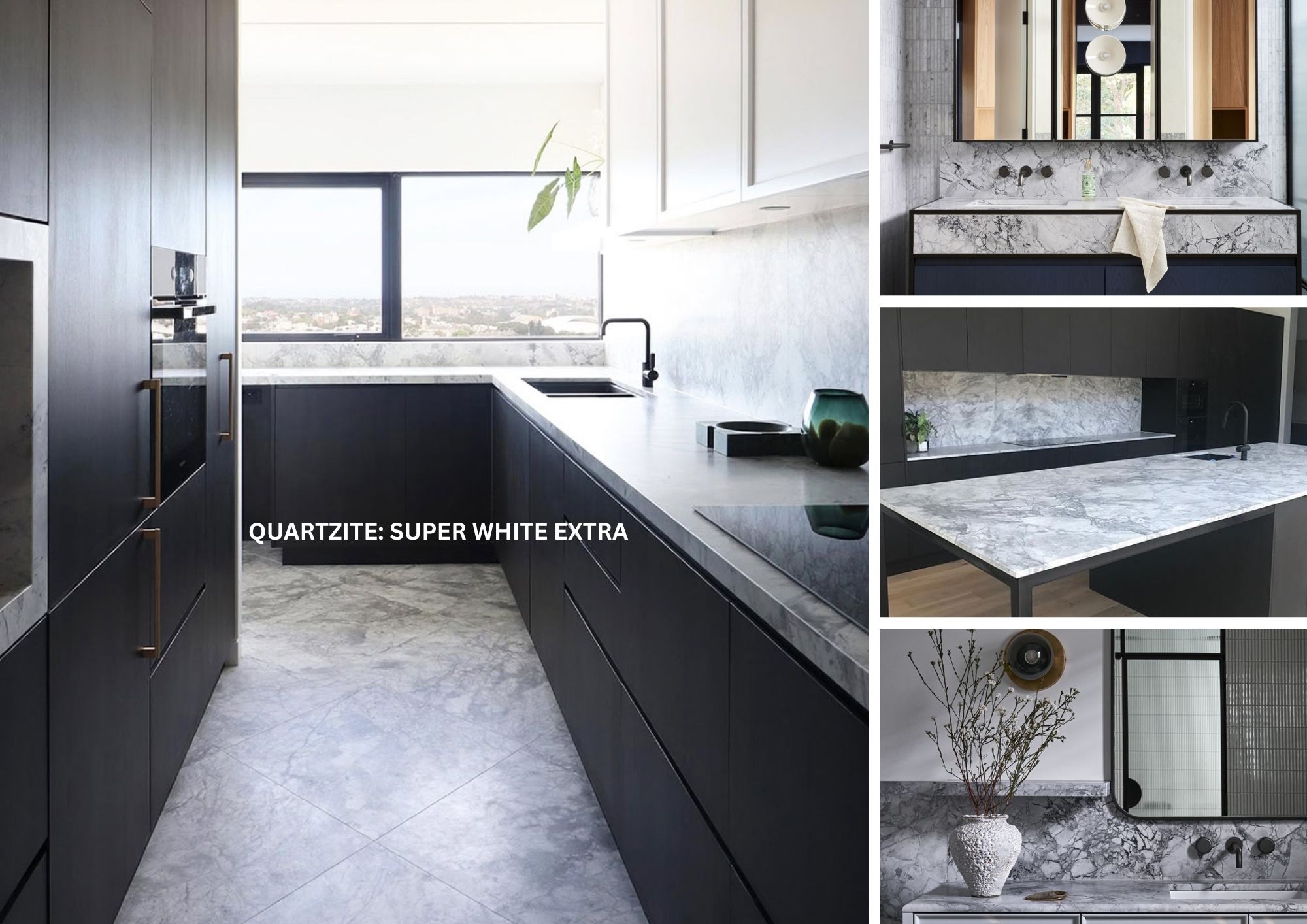 Super White Extra is a dramatic white and gray Brazilian quartzite offering sweeping dramatic veins. This natural stone is the perfect choice to create elegant countertops, stunning kitchen waterfall islands, tile floors, and other features throughout the property. (BATCH 26240)