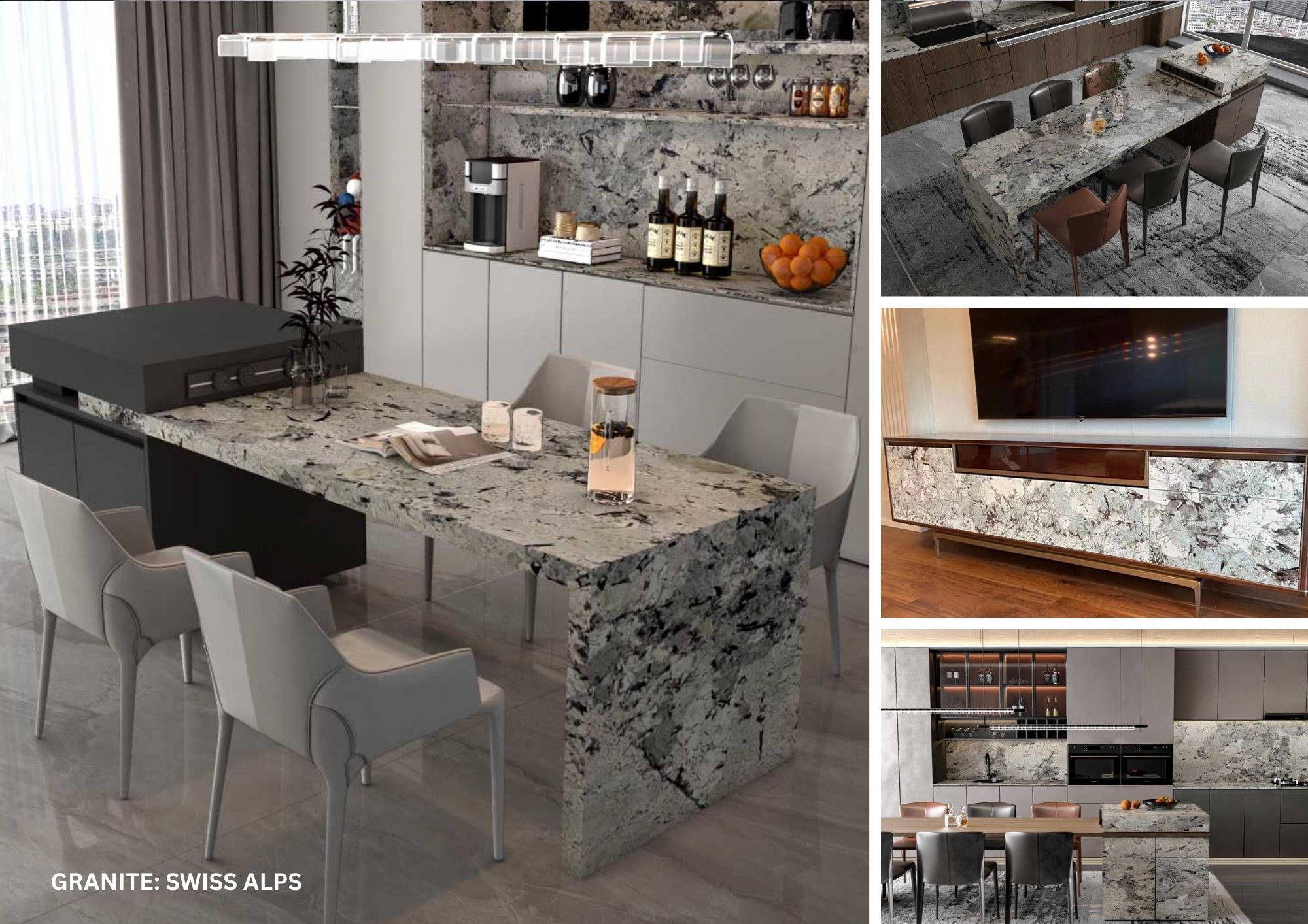 Swiss Alps granite features a warm white background that is elegantly contrasted with rich Bordeaux flecks, hints of black, and a sprinkling of white crystals. (BATCH 4491)