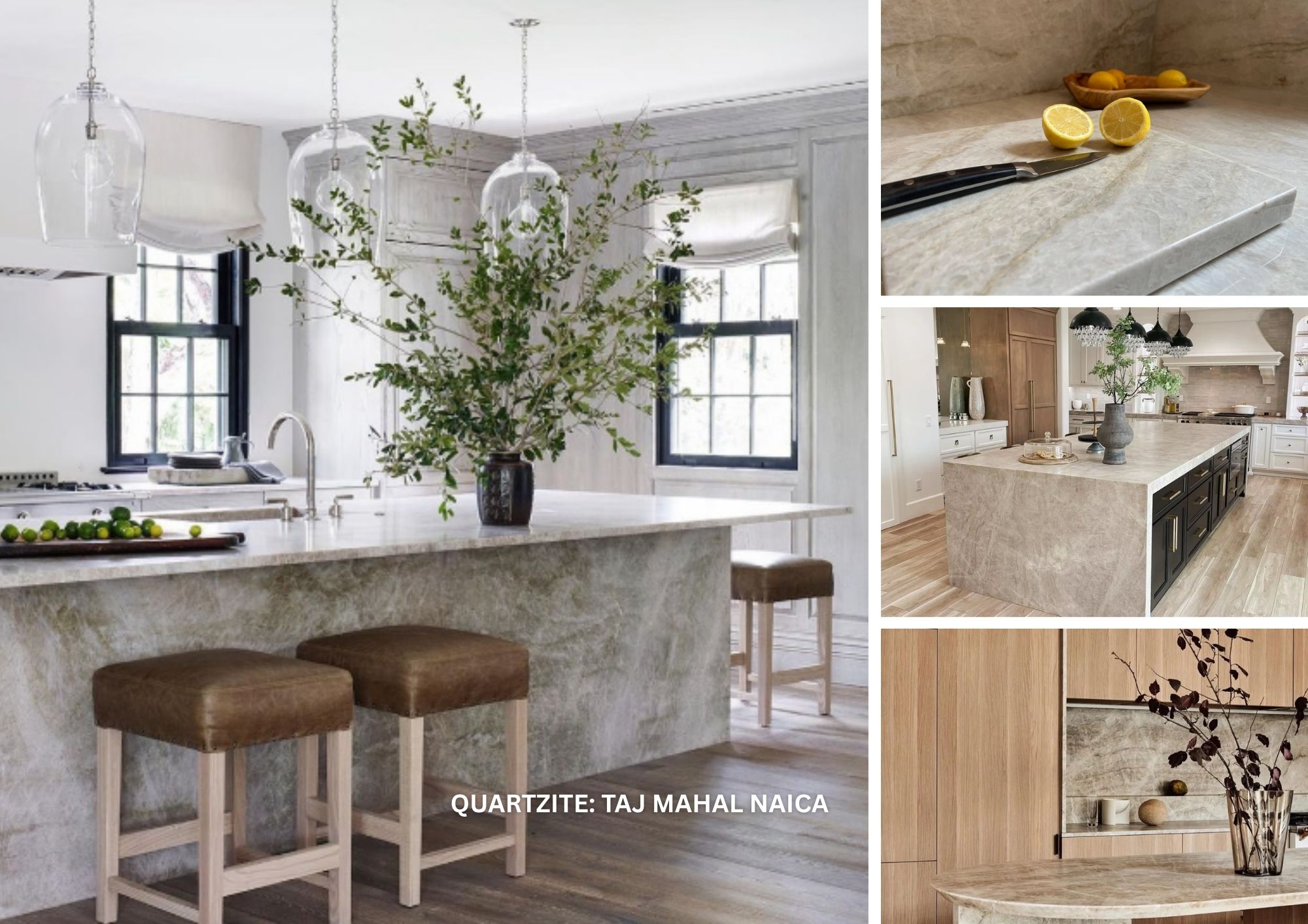 Taj Mahal quartzite features a soft white background and subtle gold veins. All natural quartzite is more durable than granite, and is known for its wispy and dramatic veins like marble. Use this elegant natural stone to create beautiful quartzite countertops, waterfall islands, floors, and accent walls throughout the home and commercial properties. (BATCH 4793)Â Leathered