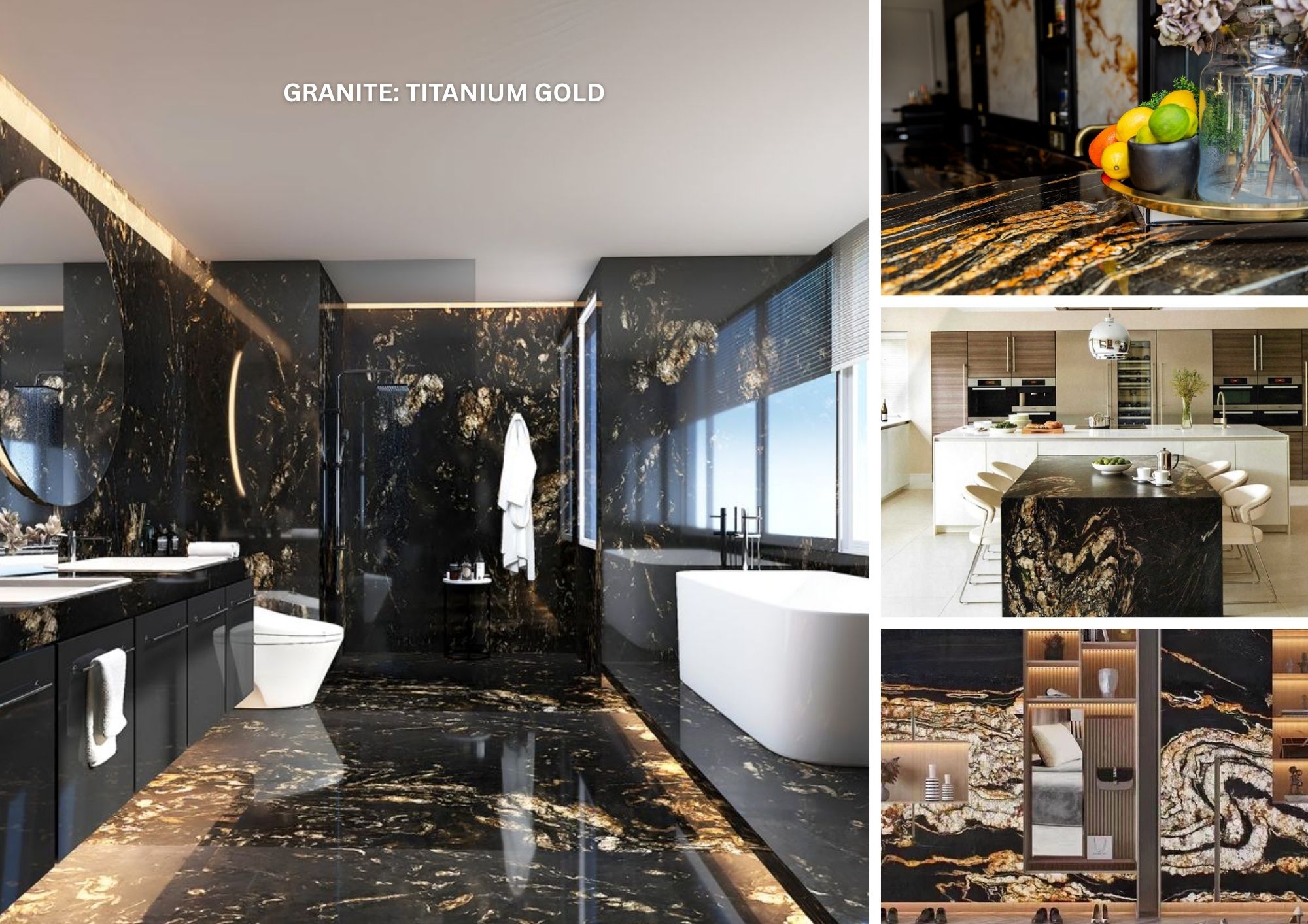 Titanium granite from Brazil is filled with elegant movement of greys, blacks, golds, creams and ivory. This durable granite is perfect for any indoor or outdoor project in freezing climates and can include landscaping, counter tops, kitchens and bathrooms.