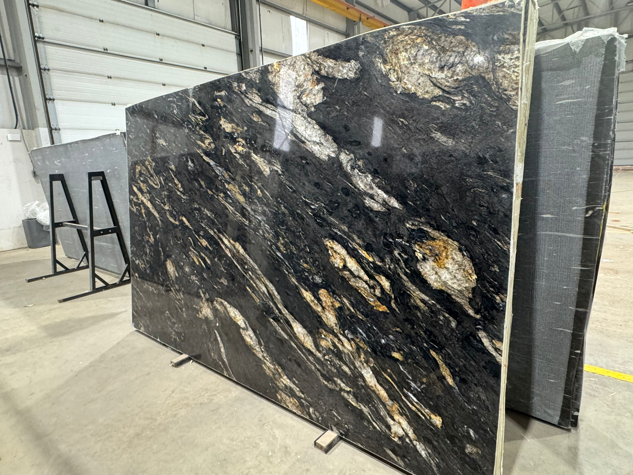 Titanium granite from Brazil is filled with elegant movement of grays, blacks, golds, creams and ivory. This durable granite is perfect for any indoor or outdoor project in freezing climates and can include landscaping, countertops, kitchens and bathrooms.