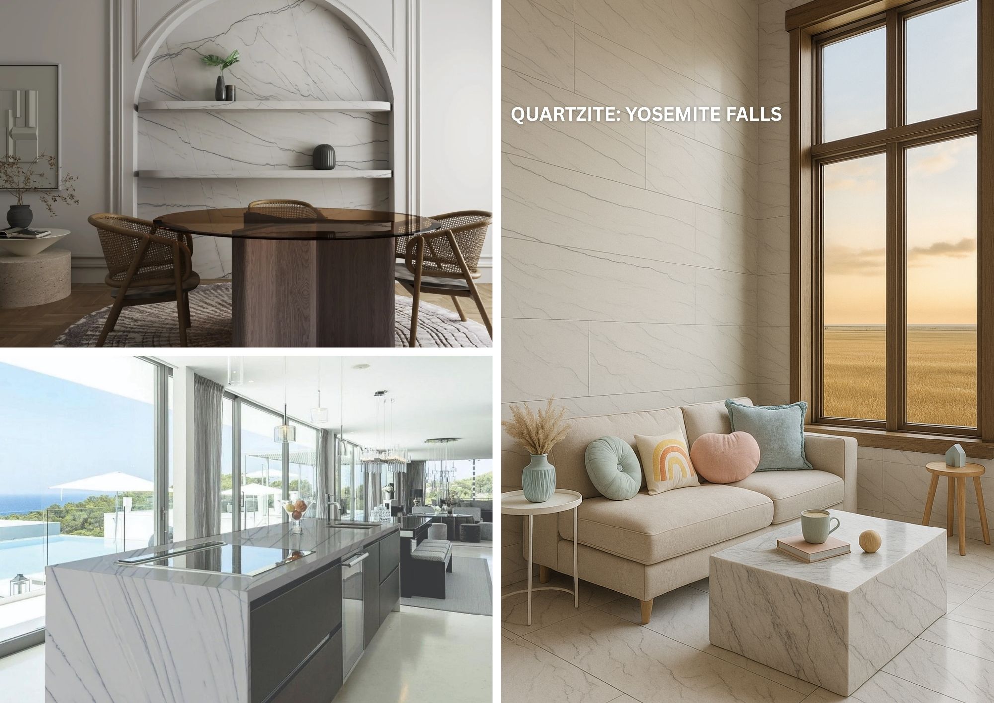 Yosemite Falls quartzite is a light white natural stone with an exotic look of gray veining. (BATCH 25088)